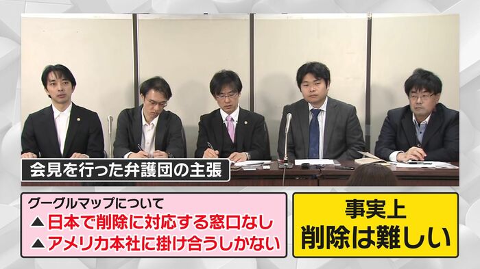 また、会見を行った弁護団によると、グーグルマップについては、アメリカ本社にしか掛け合う窓口がなく、事実上削除は難しいと主張しています。