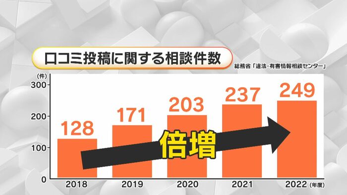 総務省の「違法・有害情報相談センター」によると、この“口コミ”投稿に関する相談件数が、2018年は128件だったのが、2022年には249件と、ここ5年でほぼ2倍に増加したとのデータもあります。