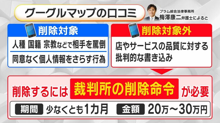 口コミなどの問題に詳しい梅澤康二弁護士によると、グーグルマップの口コミは、無断で個人情報をさらすような投稿などは、削除の対象とされていますが、現時点では店やサービスの品質に関する批判的な投稿は、削除の理由にはならないとしています。