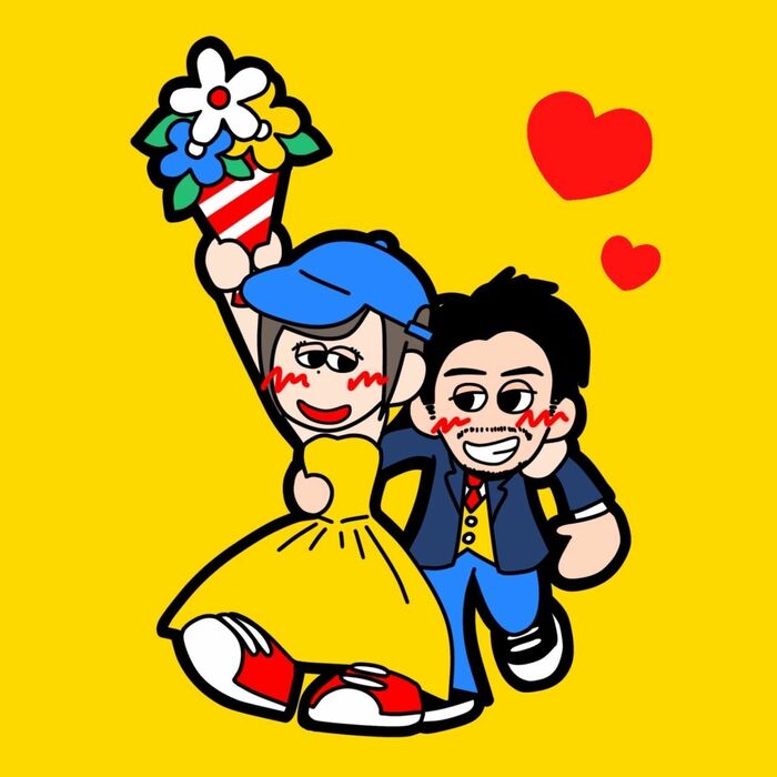 さらに、自身のXにも大家さんと岩田さんの似顔絵イラストも投稿。黄色のドレスを着て帽子をかぶった大家さんと、黄色のベストにジャケットを羽織った岩田さんが笑顔で寄り添う様子が。仲良く幸せそうな2人がかわいらしいポップなデザインで描かれています。