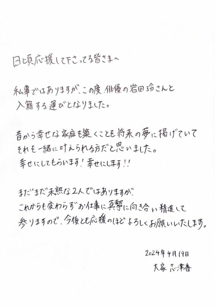 「昔から幸せな家庭を築くことを将来の夢に掲げていてそれを一緒に叶えられる方だと思いました。幸せにしてもらいます!幸せにします!!」と、喜びがにじみ出た幸せいっぱいの直筆コメントを発表。