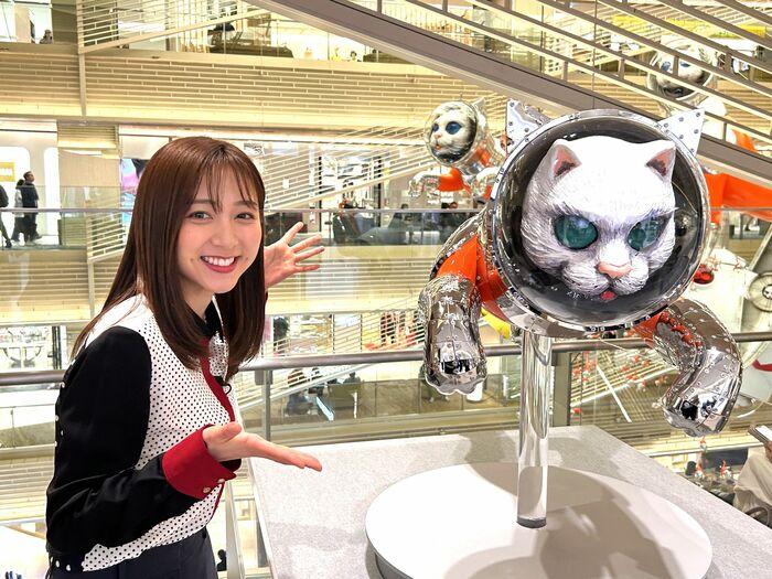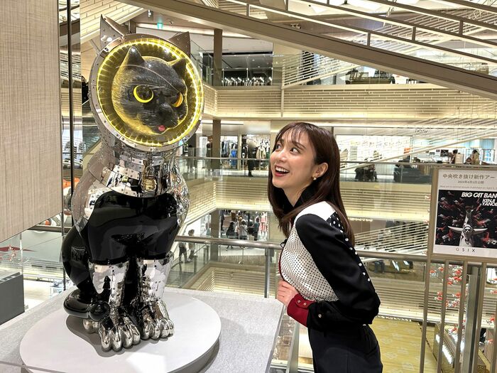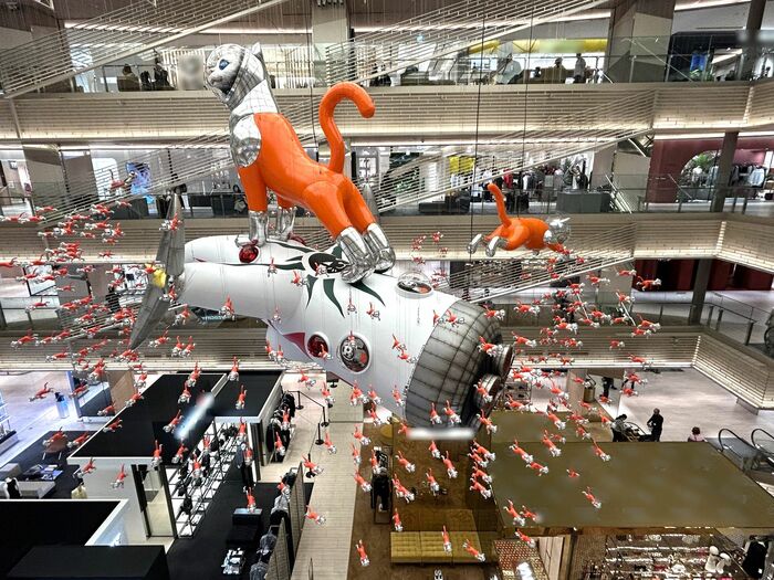 ヤノベケンジさんは、ユニークな巨大彫刻で知られる現代美術作家で、GINZA SIXの中央吹き抜け空間を貫く巨大アートのタイトルは「BIG CAT BANG(ビッグ キャット バン)」。「猫大爆発!」です。