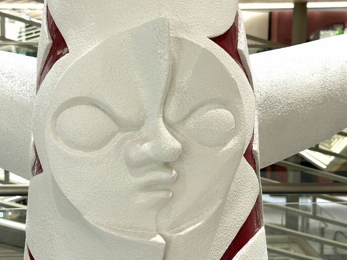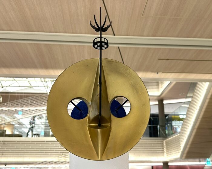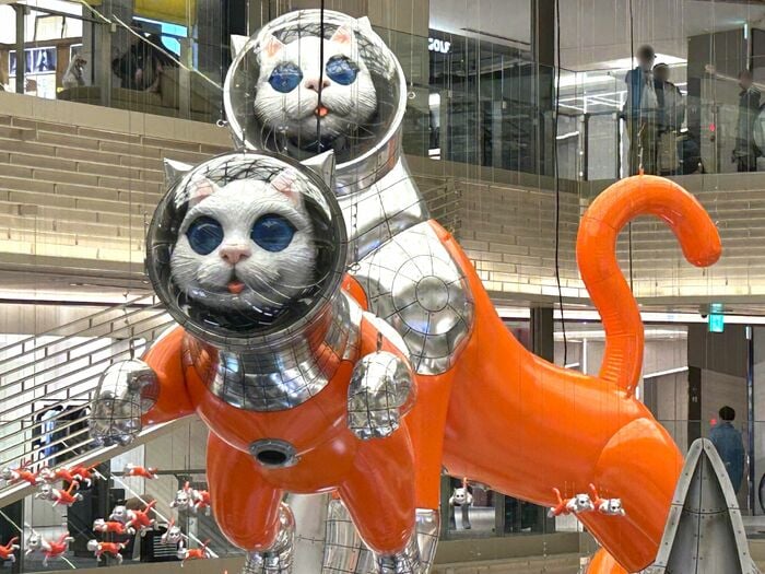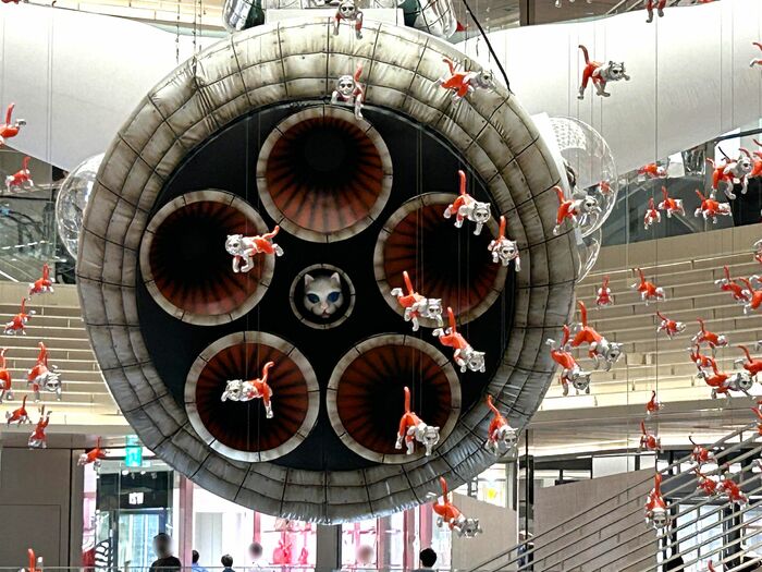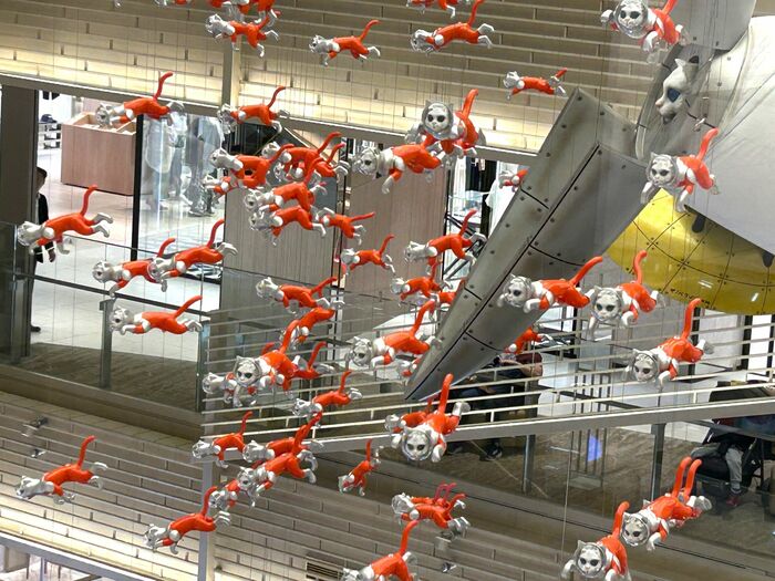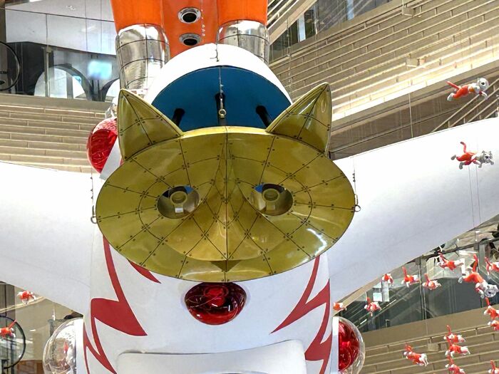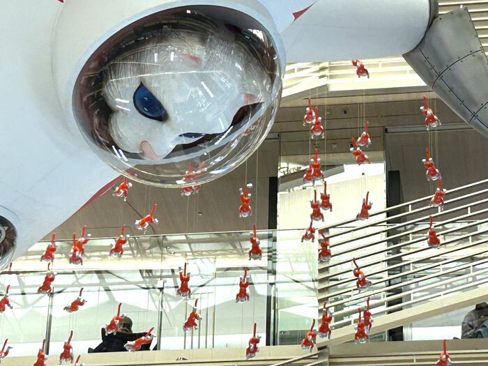 吹き抜けアートの細部を見てみると、塔の頂部の未来を象徴する「黄金の顔」は「黄金の猫」に、現在を象徴する正面の「太陽の顔」は「白猫の顔」に、過去を象徴する背面の「黒い太陽」もしっかり「黒い猫」と、見事な「太陽の塔」へのオマージュになっています。