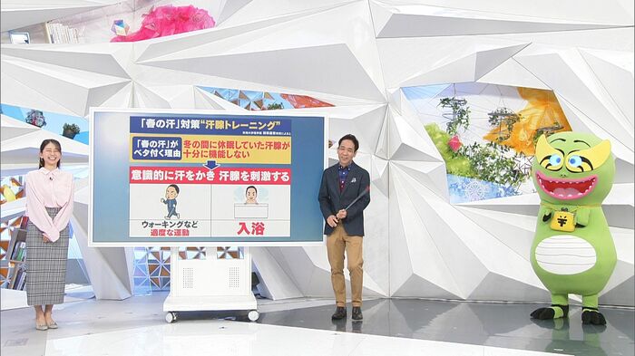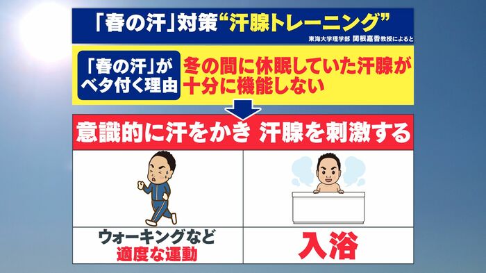 東海大学理学部 関根嘉香教授によりますと、対策としては意識的に汗をかいて、汗腺を刺激するといいとのことです。春は冬の間に休眠していた汗腺が十分に機能していない状況ですから、汗をかきやすい体をつくるというのがポイントです。