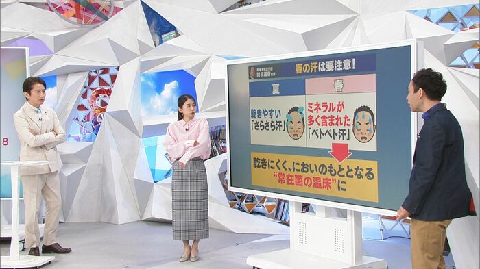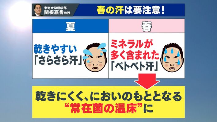 一方、春の汗について、東海大学理学部 関根嘉香教授に伺うと、「汗腺がまだアクティブになってない、動ききってないので一つの汗腺に対する負担が大きくなる」ようなんです。そのため、ミネラルが非常に多く含まれた「ベトベトした汗」が出やすいということなんですよ。
