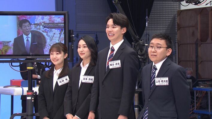 今年の新人は、上垣皓太朗(うえがき・こうたろう)アナ、梶谷直史(かじたに・なおふみ)アナ、高崎春(たかさき・はる)アナ、宮本真綾(みやもと・まあや)アナの4人。