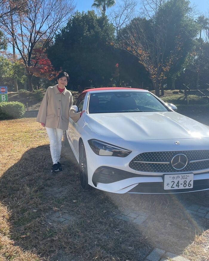 公開された写真には、赤のニットにベージュのコートを羽織り、白のパンツをあわせたコーディネートの菊川さんが、メルセデス・ベンツのオープンカーに手を添えている様子が。