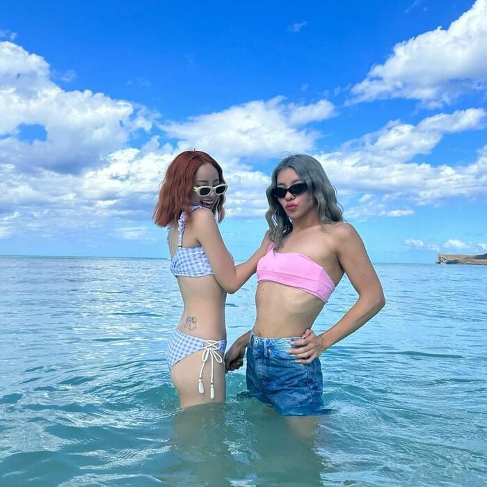投稿では、ピンクのビキニトップスにショートデニムでキメた、とうあさんの肩に手を当てイケイケな2ショットも公開!
