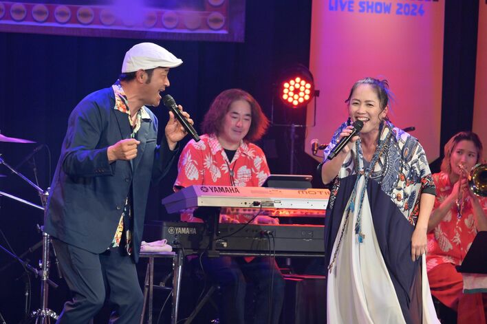 大ヒット曲「涙そうそう」などを披露したほか、ぐっさんと昭和のヒットソング「また逢う日まで」を披露。満員の観客を沸かせました。