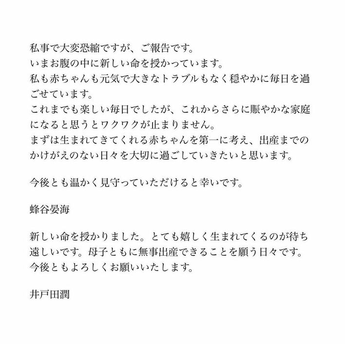 また、妻の蜂谷さんは「いまお腹の中に新しい命を授かっています。私も赤ちゃんも元気で大きなトラブルもなく穏やかに毎日を過ごせています」と母子ともに健康であることを明かしました。