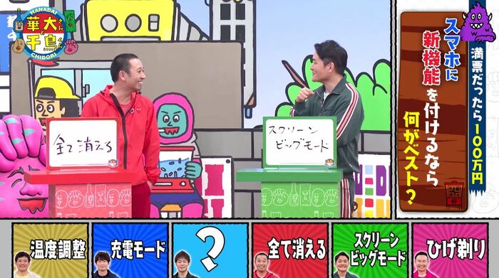 大吉さんは、スマホからイヤホンなどに電気を移せる「充電モード」。華丸さんは、スマホ自体が使い捨てカイロや保冷剤になる「温度調節」を、それぞれ提案しました。