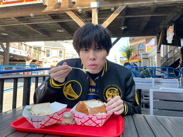 気を取り直して向かったのは、レストランが立ち並ぶ観光地のフィッシャーマンズ・ワーフ。ここで朝食をとろうとお店を探し始めるも、小走りの萩原さんが向かったのは、カリー選手のユニフォームが飾られたスポーツショップ。