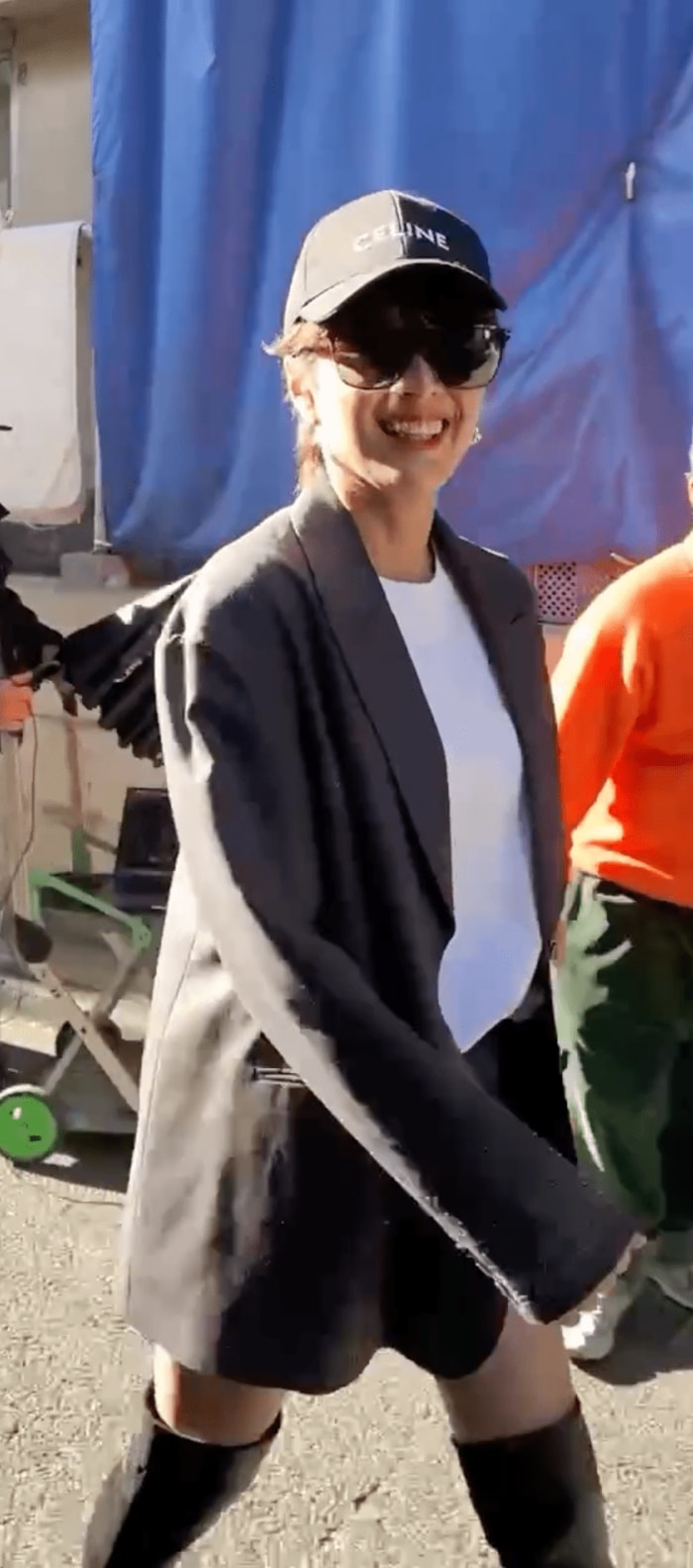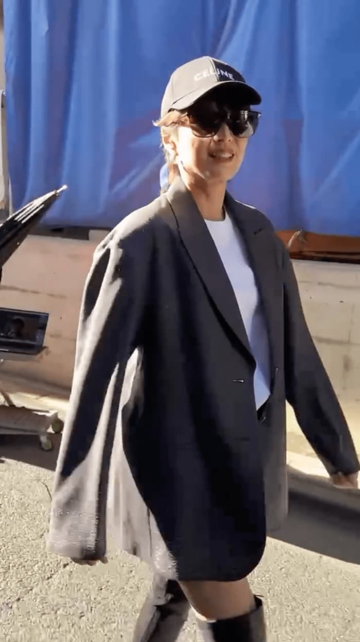 動画では、黒の帽子にサングラス、グレーのジャケットを羽織ったクールなコーデに。カメラに向かって笑顔を見せていました。