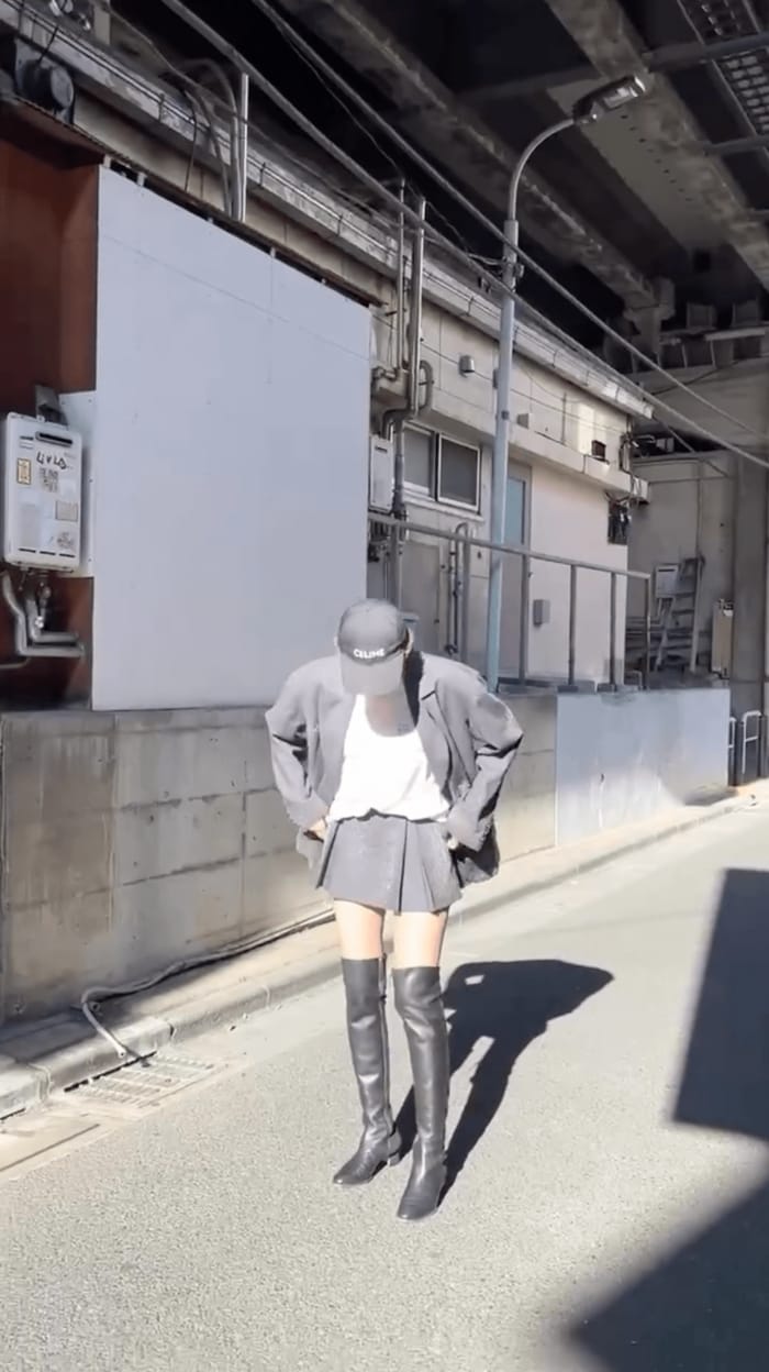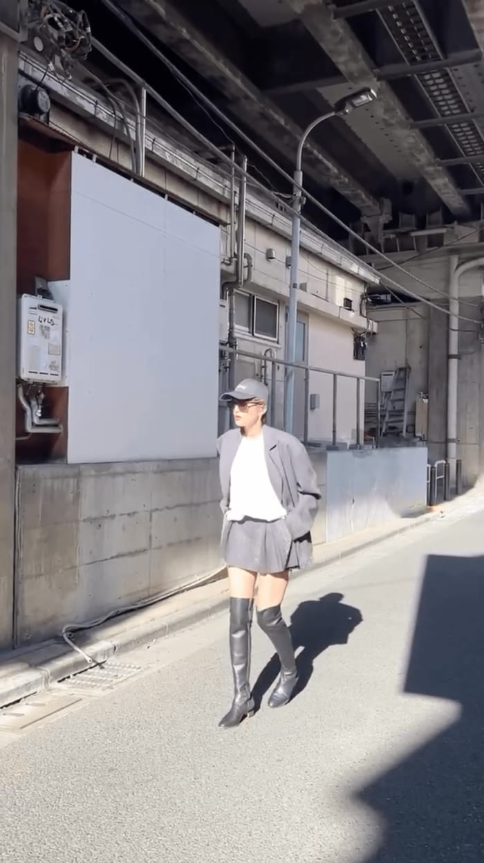 動画の終盤では歩きを止めて、全身のコーディネーションを再確認!黒のニーハイブーツに、グレーのミニ丈スカートのコーデの、太ももあらわな“絶対領域”を見せてくれました。
