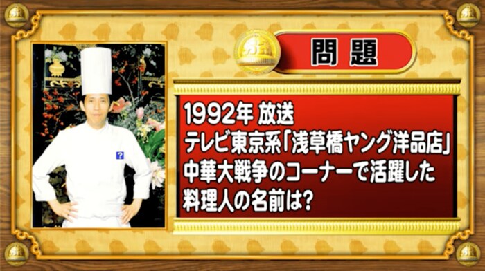 次は、料理人問題。今から32年前の1992年に放送されたバラエティ番組『浅草橋ヤング洋品店』(テレビ東京)の「中華大戦争」のコーナーで活躍した、こちらの料理人の名前は何でしょうか?