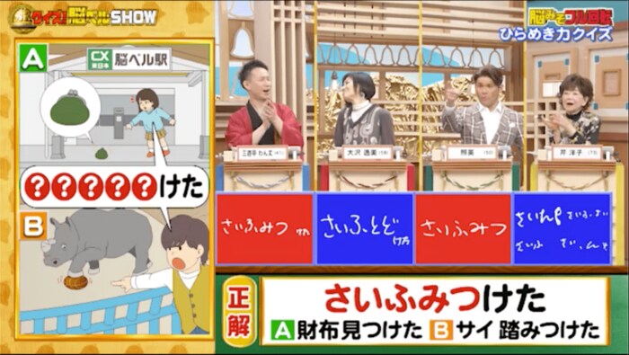 正解は「さいふみつけた(財布見つけた/サイ踏みつけた)」。わん丈さんと照英さんの2人が正解。