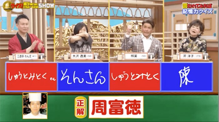 正解は「周富徳(しゅう・とみとく)」。わん丈さんと照英さんが正解!