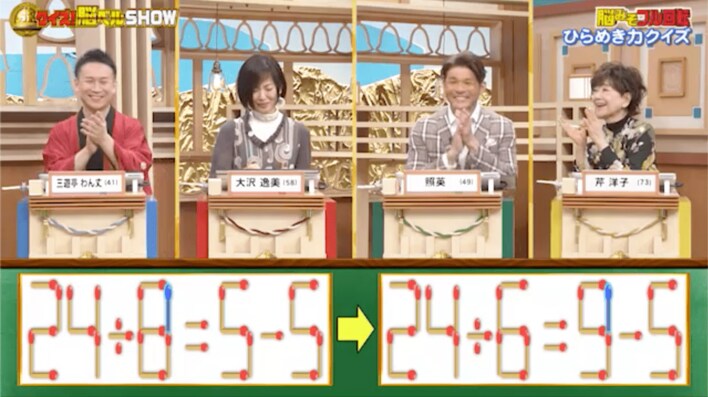 今回の解答者は、落語家・三遊亭わん丈さん(41)、元アイドル・大沢逸美さん(58)、俳優の照英さん(49)、歌手の芹洋子さん(73)の4名です。