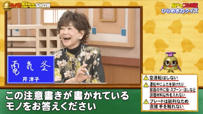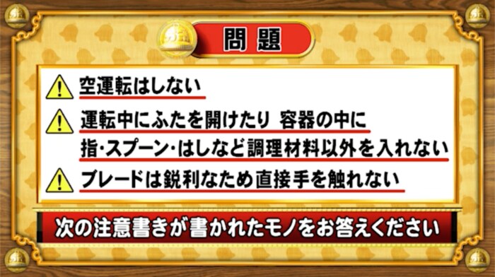 芹さんの答えは、「電気釜」。そのほかの注意書きは当てはまりそうですが、ブレードは使ってないかも…。残念ながら不正解。