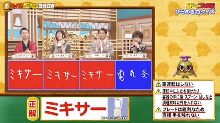 正解は「ミキサー」。わん丈さん、大沢さん、照英さんの3人が正解です。