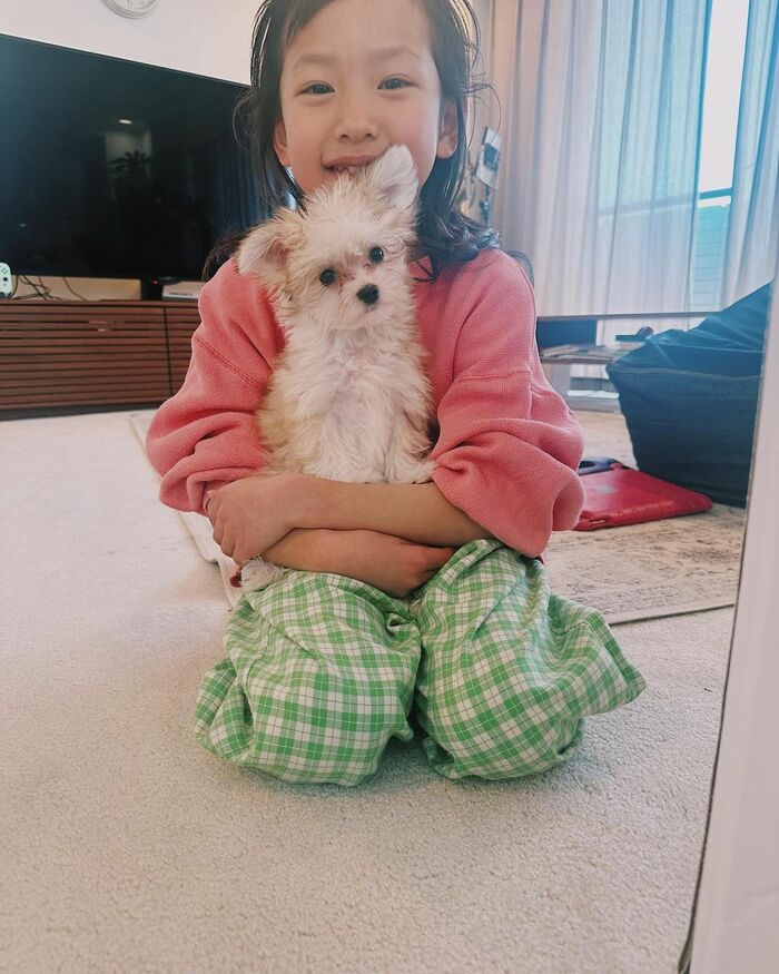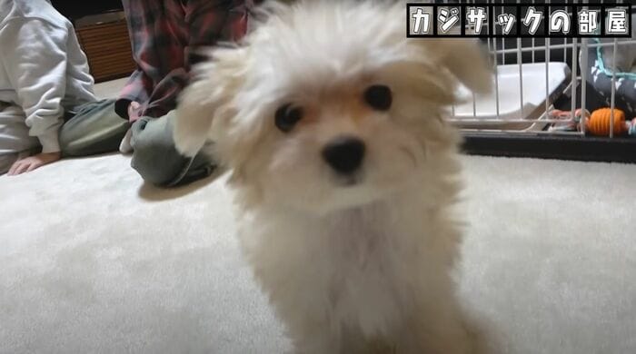 カジサックさんは、「我が家に新しい家族がやって来ました。チワワ×マルチーズのMIX犬」というコメントと共に、次女と愛犬のかわいすぎる2ショット写真を投稿。犬の名前は、「梶原あられ」ちゃんにしたことも明かしました。