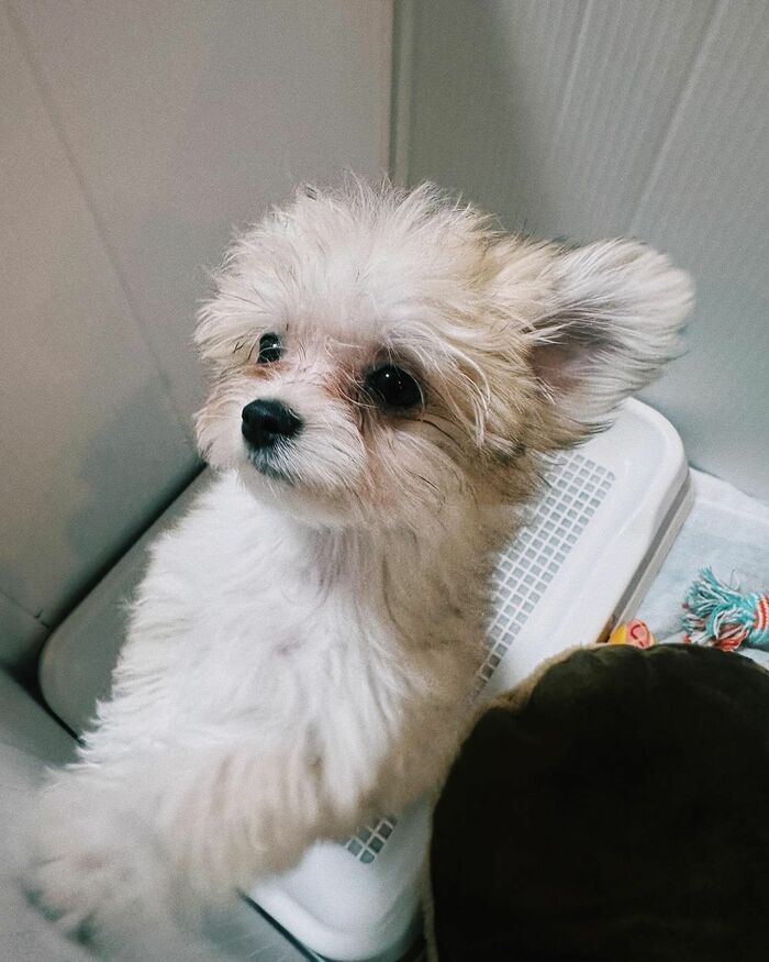 「この頃は3ヶ月の頃で耳が立っています お顔はマルチーズ譲りで毛も抜けないところがマルチーズ、チワワっぽいのは首のあたりがマフラーしてるみたいに白くなってるところです 耳は根元が立っていて大きいところがチワワ感ありますが先っちょが折れたりとまだまだどちらに似るかわからない感じです」とチワワとマルチーズのそれぞれ似ている特徴を解説したカジサックさん。