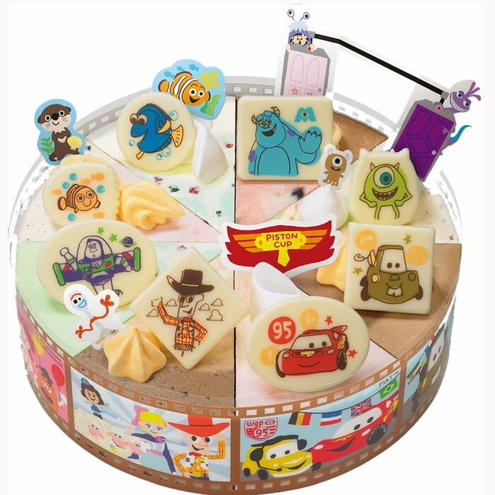 また、キャラクターなどのピックも付いてくるので、自由に飾れるのも楽しみの1つ!さらに、ケーキを包むフィルムにはピクサーのキャラクターがたくさんデザインされているのにも注目です。