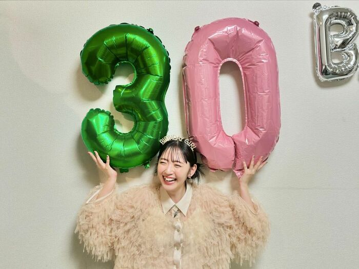 鈴木さんは「30歳になりました」と題し、「30」や「HAPPY BIRTHDAY」のバルーンの装飾の前で撮影したお祝いショットを公開。