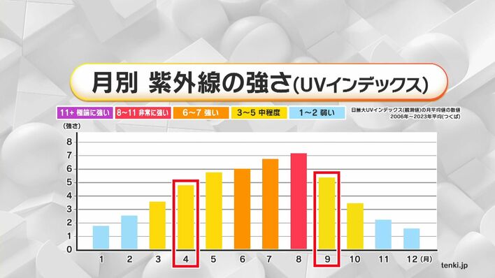 tenki.jpによる、紫外線量を月平均でまとめたデータを見ると、4月は夏の暑さが残る9月と同等の強さだということが分かります。