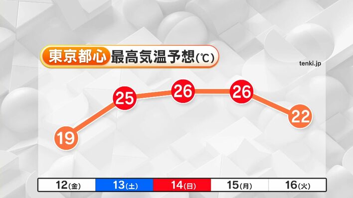 4月13日(土)は最高気温が25度、日曜日と月曜日も26度と、3日連続で「夏日」の予想。