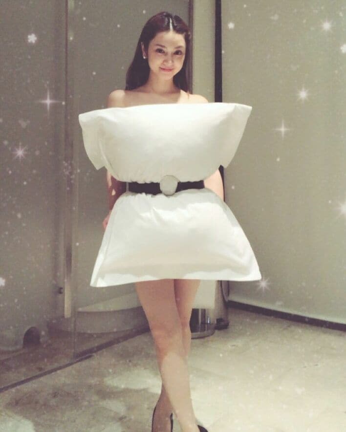 純白のドレスに見えたのは実は…ウエスト部分をベルトで巻いて止めただけの“枕”でした。