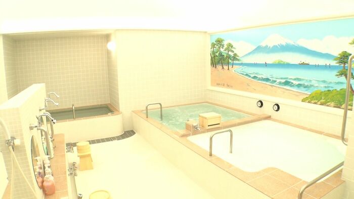 大人料金は520円で、大きく富士山の描かれた壁画を眺めながら「熱湯」「ミルク風呂」「水風呂」の3つの浴槽を楽しめます。