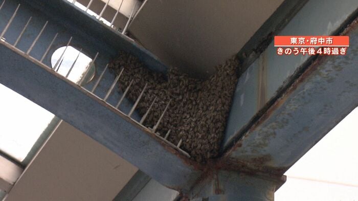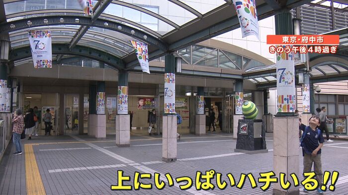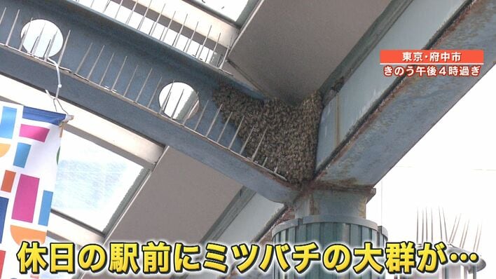 2024年4月7日日曜日、1日 7万5000人以上が利用する京王線・府中駅の南口に現れたのは、駅前通路の屋根の一角にびっしりと集まったミツバチです。