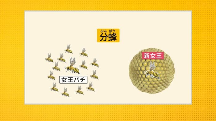 分蜂とは、一つの巣に新しい女王バチが生まれた時、古い女王バチが、巣にいる働きバチを連れて集団で巣を離れること。