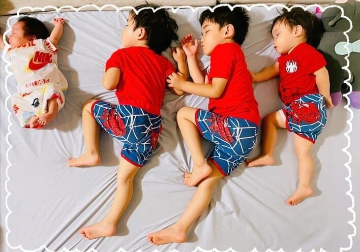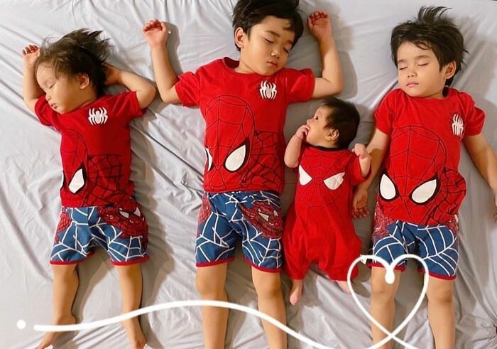 投稿された写真は、兄弟で同じ方向を向いて眠る写真や、長男と末っ子が見つめ合う姿など、さまざまな4兄弟の寝相ショット。平さんは写真とともに、「寝相もすっかりバラバラ。これまで並んで寝てたカオス達♡いつの間にか寝相も一緒じゃなくなってる」とつづりました。