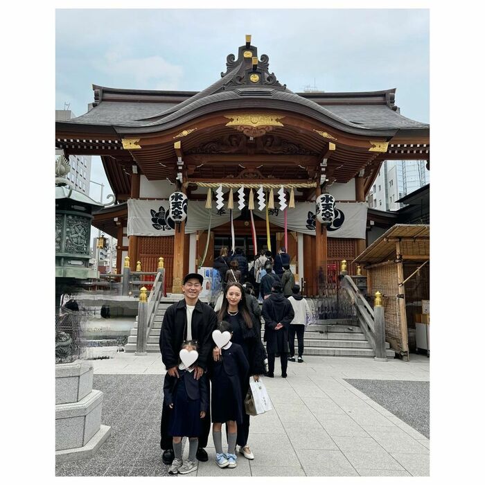「娘たちのお土産を買って安産祈願へ 無事に元気に産まれて来ますように」と、お花見の後は家族で安産祈願に行ったことを明かしつつ、娘たちとの家族写真も公開しました。