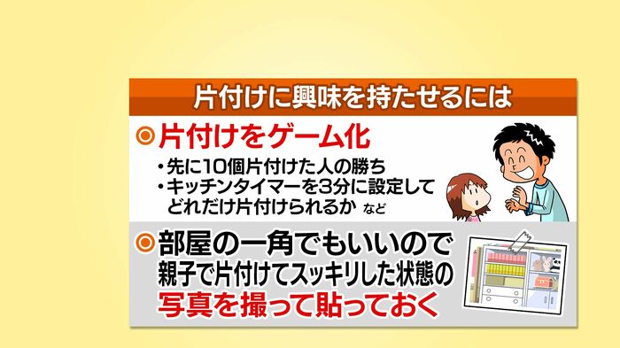 親野先生は「ゲーム感覚で片付ける」「スッキリした状態を写真に撮って部屋に貼っておく」など、子供が楽しくなる片付けの方法を提案しました。