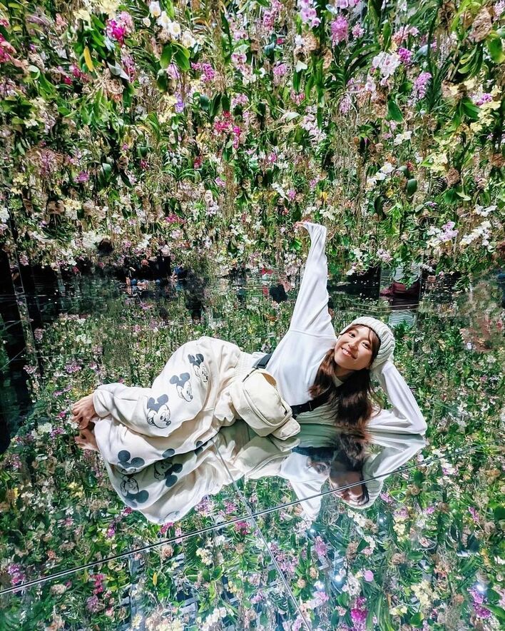 お花が飾られているエリアで横になってみる若槻さん。