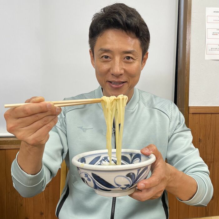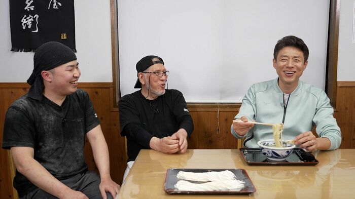 松岡さんはつやつやとしたうどんを前に、「色がちょっと違う」と感想を伝えて早速ひと口すすると、「これは初めての食感です」とびっくり。「ツル、モチ、シコ、うどんの良さが全部入ってる。噛んでいるときに何とも言えない味が出てくるんですよ」とほほ笑みます。