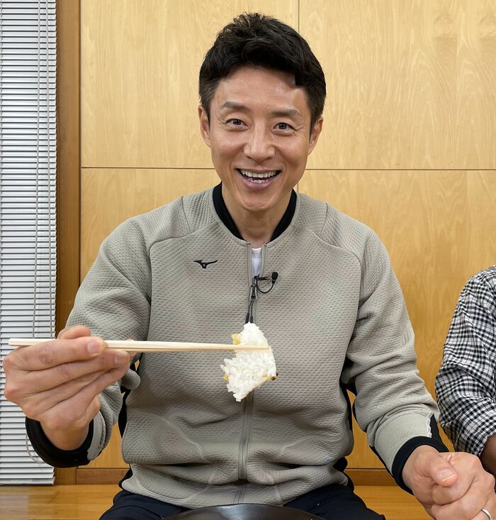 まずは「ゆうれいの部分を食べてみますね」と、松岡さんは表面の白いご飯だけをひと口。「しっかり味がついてる。お米がおいしいですね」と驚くと、「山水を利用してできたお米です」と、井上さんがおいしさの理由を解説。