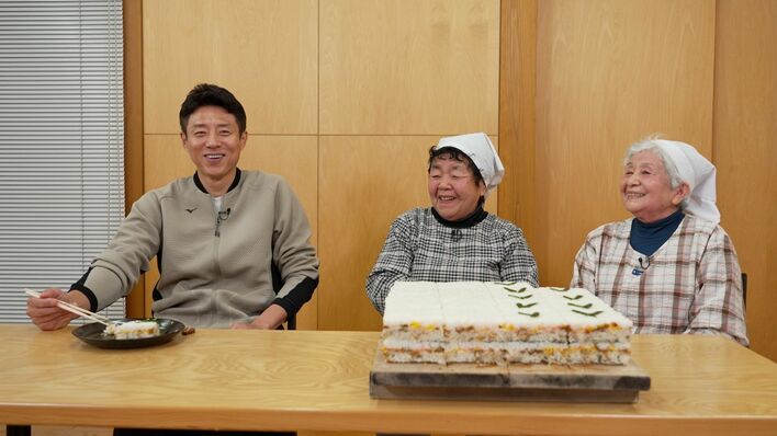 山口県宇部市を訪れた松岡さんは、井上清美代さんと千々松和子さんに郷土料理の「ゆうれい寿司」を作ってもらうことに。ふたが閉じた容器を前に、「ふたを取ったらゆうれいが現れる?」と少し腰が引けながらたずねる松岡さんに、2人は笑顔で頷きます。