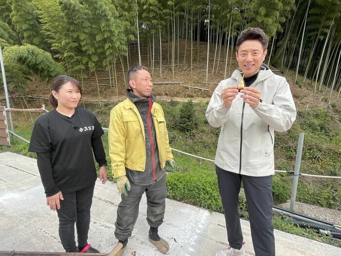 たけのこ掘りのシーズンはおよそ2ヵ月。その期間に「命を懸けている」と西さんが熱弁すると、小原さんも「愛してます」と真っすぐな目で語ります。2人の熱い“たけのこ愛”に感銘を受けながら、焼きたけのこにしょうゆをかけて「わさびじょうゆ」でいただいた松岡さんは、「これはおいしい!」と満足顔に。