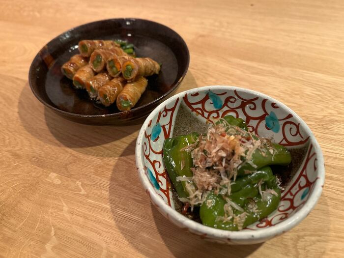 ピーマンのおかか和えは、すごく簡単で、串とかでピーマンに穴をあけて、顆粒のだしと水とみりんと醤油だけを入れてレンジでチンしたら、仕上げにかつお節をかけて出来上がりです!