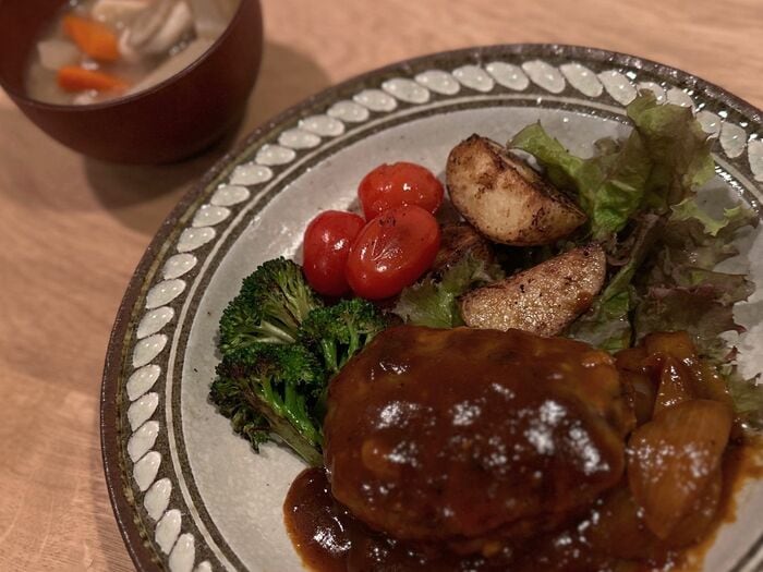 このハンバーグはソースにちょっとりんごを入れているところがポイントです。