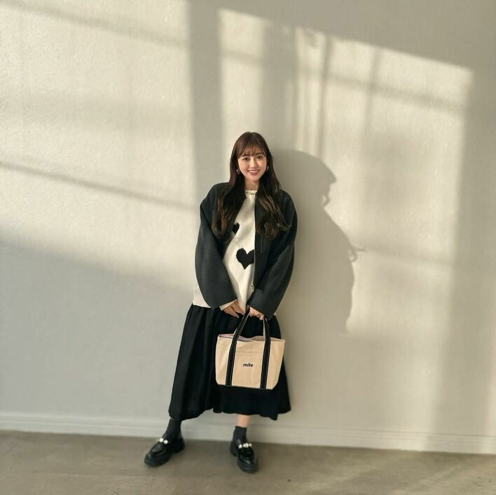 イベントでGETしたというハート柄の白ニットとサブバッグを早速取り入れたという菊地さん。ゆったりとしたシルエットのアウターとボトムスを黒で統一し、落ち着いた雰囲気でにこやかなで優しい表情を見せています。