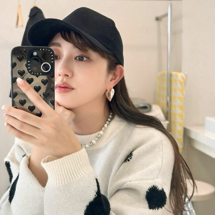 さらに、スマホを片手に鏡越しの自撮りショットを見せた菊地さんは、白ニット姿に黒いキャップを被っり、ストリートカジュアルな雰囲気に。首元の白とシルバーのネックレスにも目を引きますね。