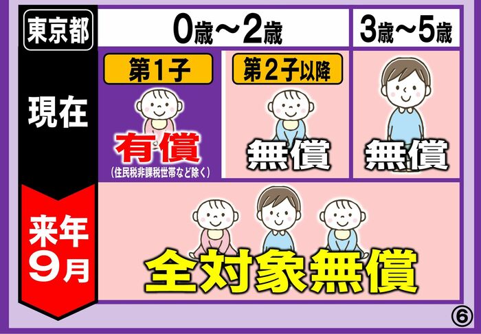 東京都は国の助成に上乗せする形で、現在は0歳から2歳の第2子以降については所得制限なしで無償としています。第1子は有償というところを、2025年9月を目標に第1子から無償に拡大する方針です。