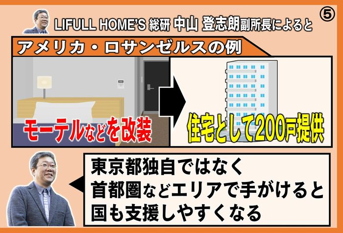 LIFULL HOME’S総研の中山登志朗副所長によると、アメリカ・ロサンゼルスの例では、モーテルなど空いている場所を改装し住宅として200戸提供。低所得の人でも買ったり住むことができるような住居を提供するという仕組みです。