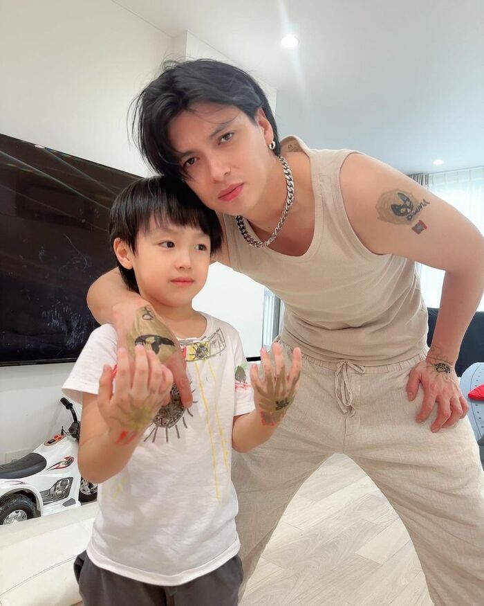 「タトゥーいれました^_^」のコメントとともに息子・カゲトラくんとツーショットでポーズを決めた写真を投稿しました。