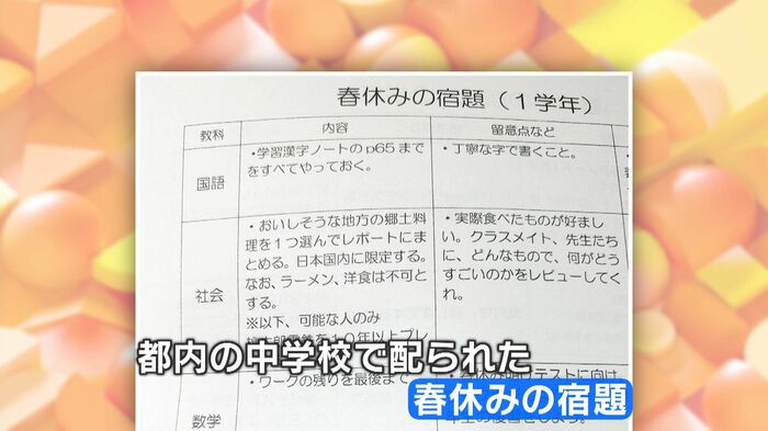 東京都内の中学校で配られたという、春休みの宿題のプリント。